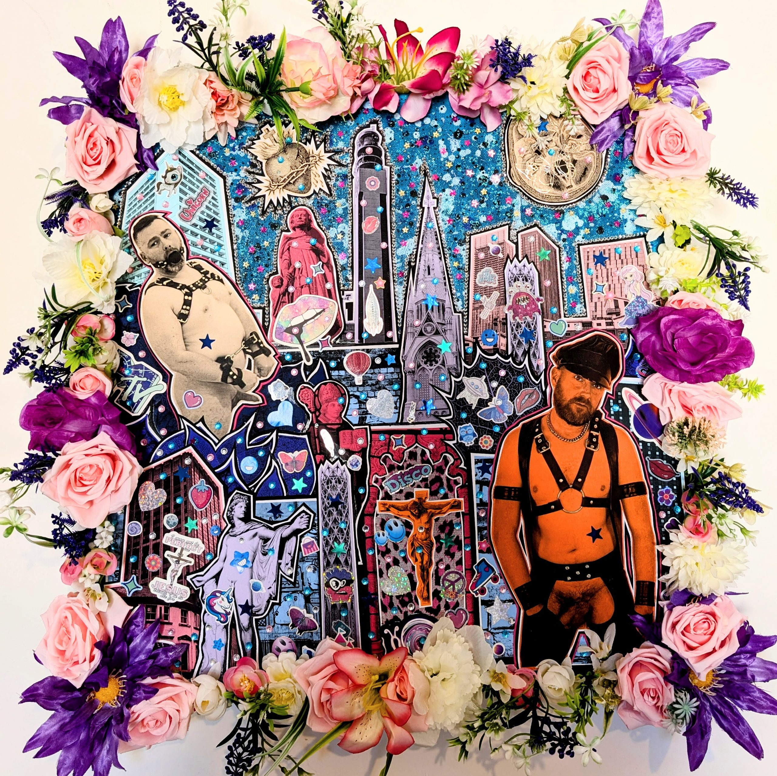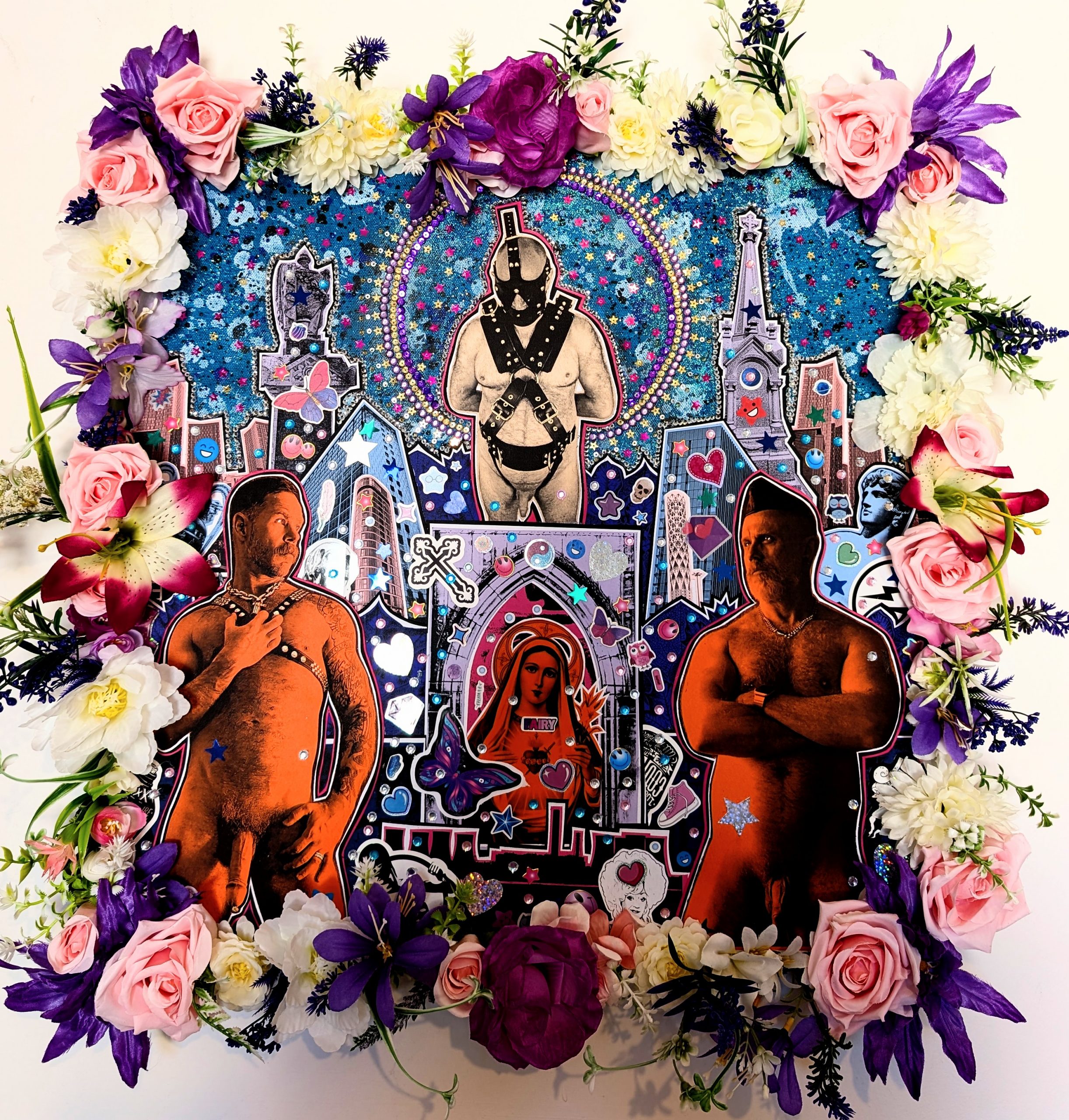 Materials: Collage, colour paper, card, acrylic paint, glitter, sequins, crystals, PVA , artificial flowers on stretched canvas.