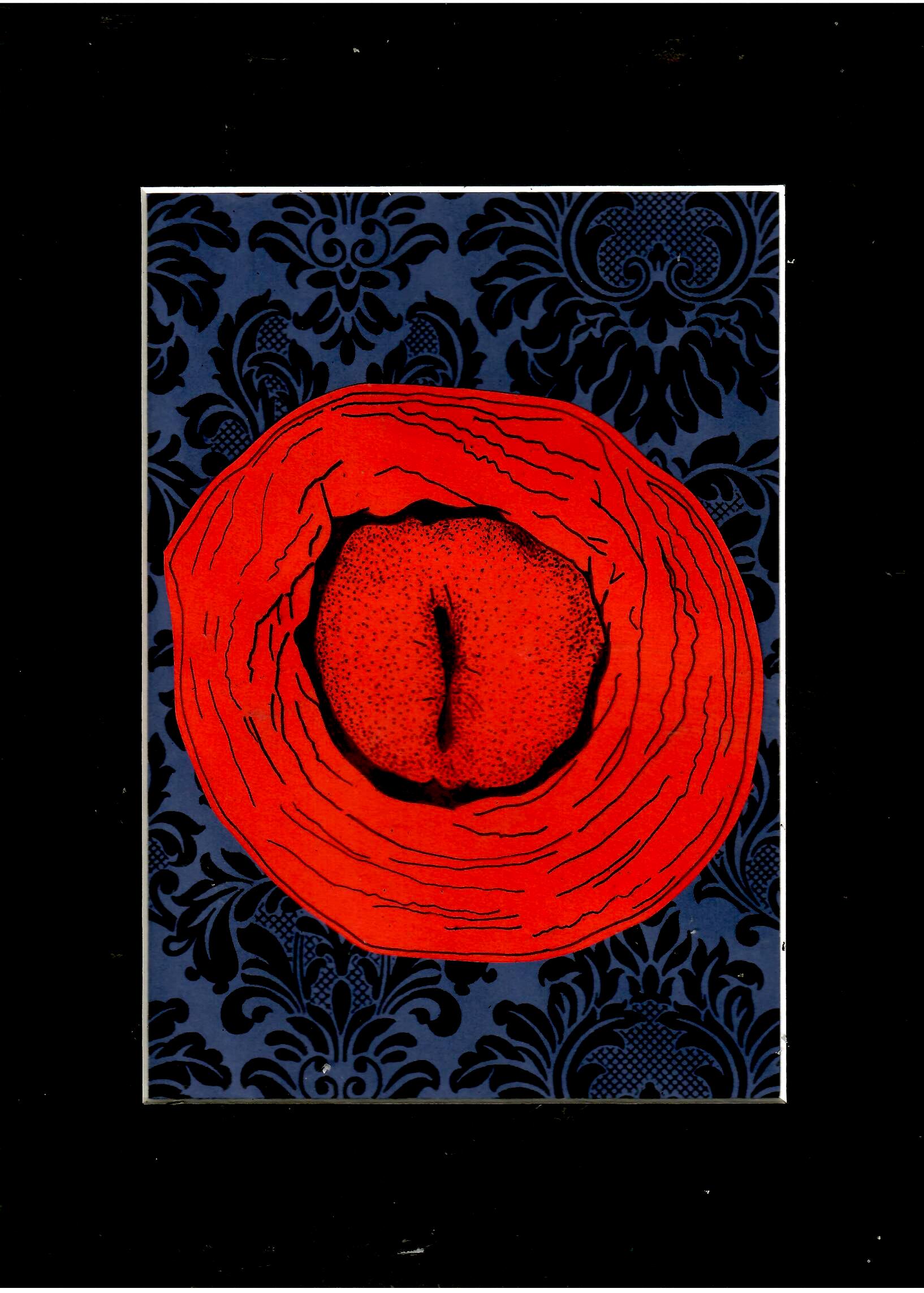 Handmade colour paper collage – Foreskin against flock wallpaper